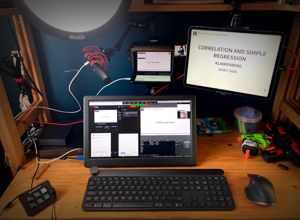 As can be seen from the picture above, I teach from my kids’ bedroom, armed with a couple of NERF’s. I use apple’s Sidecar to use my iPad as a second monitor, clamped to a shelf with a JOBI tablet grip. Placed at eye level to the right of my camera, it matches the scene when I look at the screen.